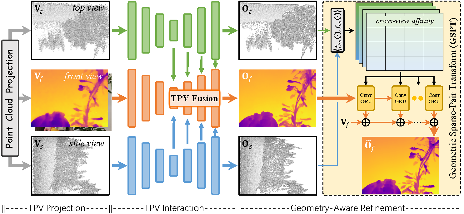 TPVD decomposes 3D point cloud into three views to capture the fine-grained 3D geometry of scenes. TPV Fusion and GSPN modules are proposed to refine the depth.